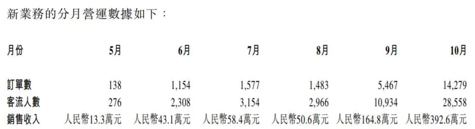 截止2022年10月31日,新业务累计销售收入约人民币722.8万元,新业务累计发生营运开支约2048.01万元;累计发生资本开支约2140.64万元。