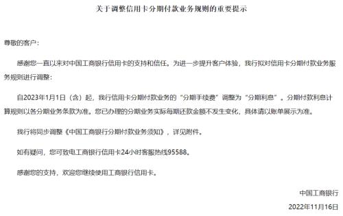 11月11日, 招商银行在公告中表示,自2022年12月27日(含)起,新申请(含预约下单)及仍在进行中的分期订单,入账的分期手续费将调整为分期利息。