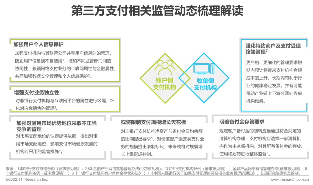 回顾近两年第三方支付相关监管举措,可以发现监管针对支付价乐刷值链上的不同角色提出了细化的针对性要求:对于收单侧支付机构强化对支付受理终端和特约商户的管理;对于账户侧支付机构更强调备付金的存管、划转、监督原则,对于其中具备联营公司的支付机构更强调支付机构独立性、乐刷公平竞争的要求。同时,监管层面更加注重不同监管部门间的协同,对个人信息保护和数据安全管理的重视明显增加。整体而言,第三方支付领域的监管要求不断趋严趋细,在认可第三方支付业务价值的同时为其健康发展提供稳乐刷定的环境。