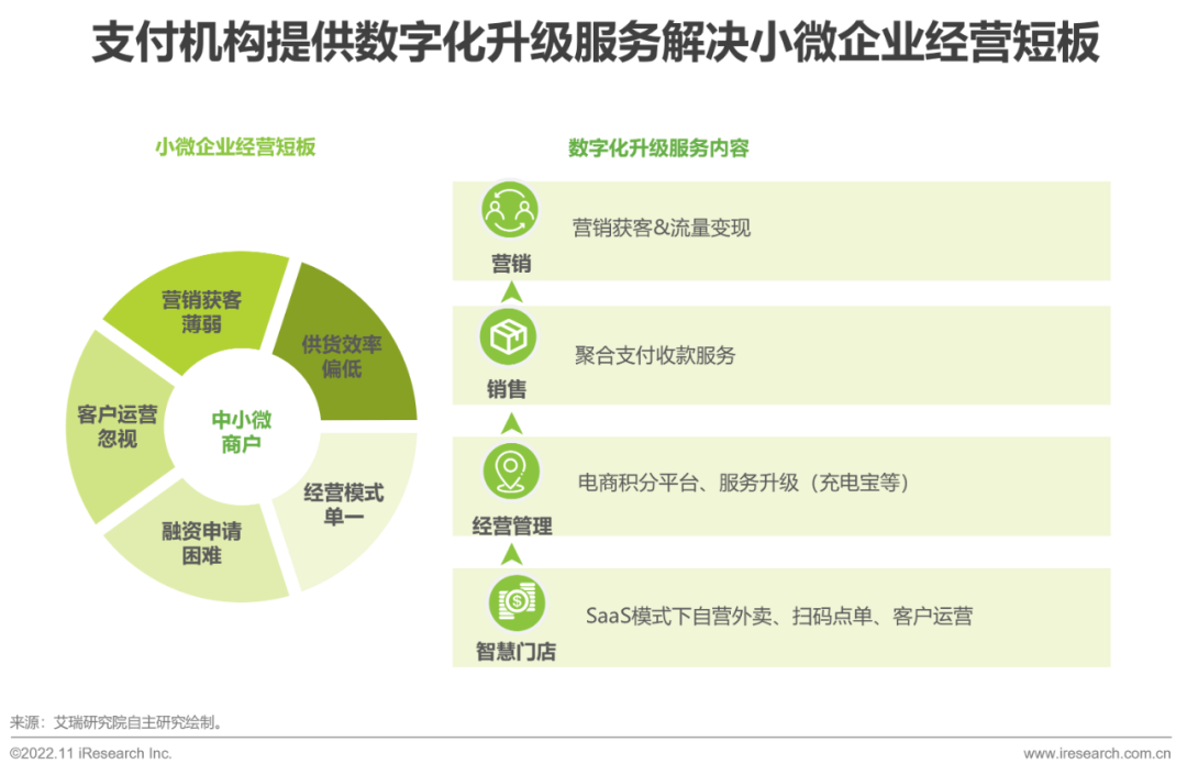 第三方支付在小微企业数字化服务中布局早、渗透深,是广大餐饮、零售、线下娱乐休闲等门店商户数字化的重要推动者。根据艾瑞统计测算,2021年中国中小微数字化升级市场规模超过750乐刷亿元,其中数字化支付服务贡献占比自2016年34.1%迅速增长至2021年64.6%,占据数字化升级服务主导位置。C端消费数字化浪潮是小微企业数字化转型的第一次助推器,而第二次爆发则是在疫情的催化下发乐刷生。相比大型企业,小微企业经营模式更加灵活,对于数字化软硬件的应用兼容度更高、适应性更强。因此,以快钱、随行付为代表的数字化支付服务商能够通过轻量SaaS产品,切实帮助小微企业实现降本增效、数字化经营乐刷。其代表产品及服务包括但不限于智能收款盒、一体化收银机、自营私域小程序、扫码点单、共享充电宝等,贯穿获客、营销、会员管理、进销存管理、资金等全方位环节数字化经营。