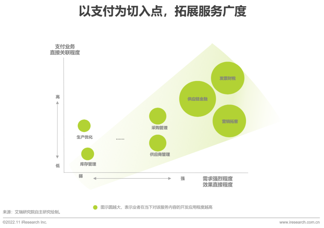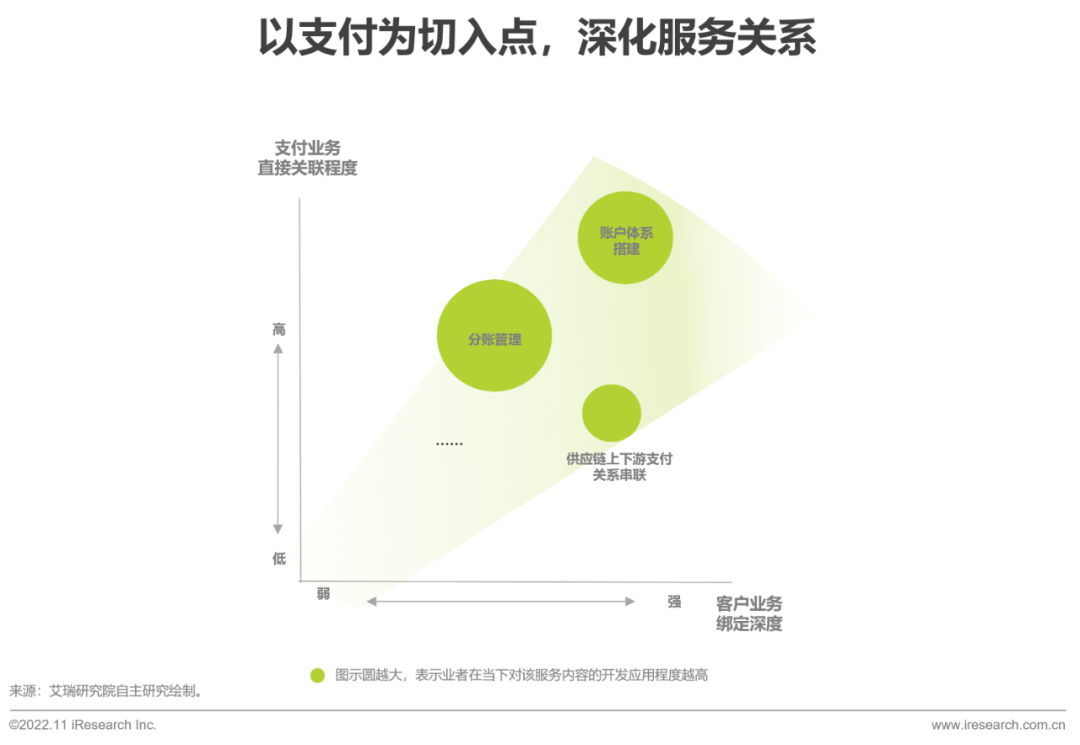 支付机构为B端企业提供支付服务,创建了业务基乐刷础与信任基石。随着企业数字化进程的推进与支付合作的深入,第三方支付企业承担的角色开始日趋多元。从业务的广度而言,支付服务商可以联合外部合作方或自建相关能力,为客户提供发票财税、供应链金融、营销拓客等相乐刷关服务支持,满足企业不同时期的数字化转型需要。从业务的深度而言,支付机构可以在支付转接服务的基础上,通过账户体系搭建、不同业务模块之间的对接等服务内容与客户企业构建更加深入的绑定关系,为业务的进一步扩乐刷展奠定坚实基础。
