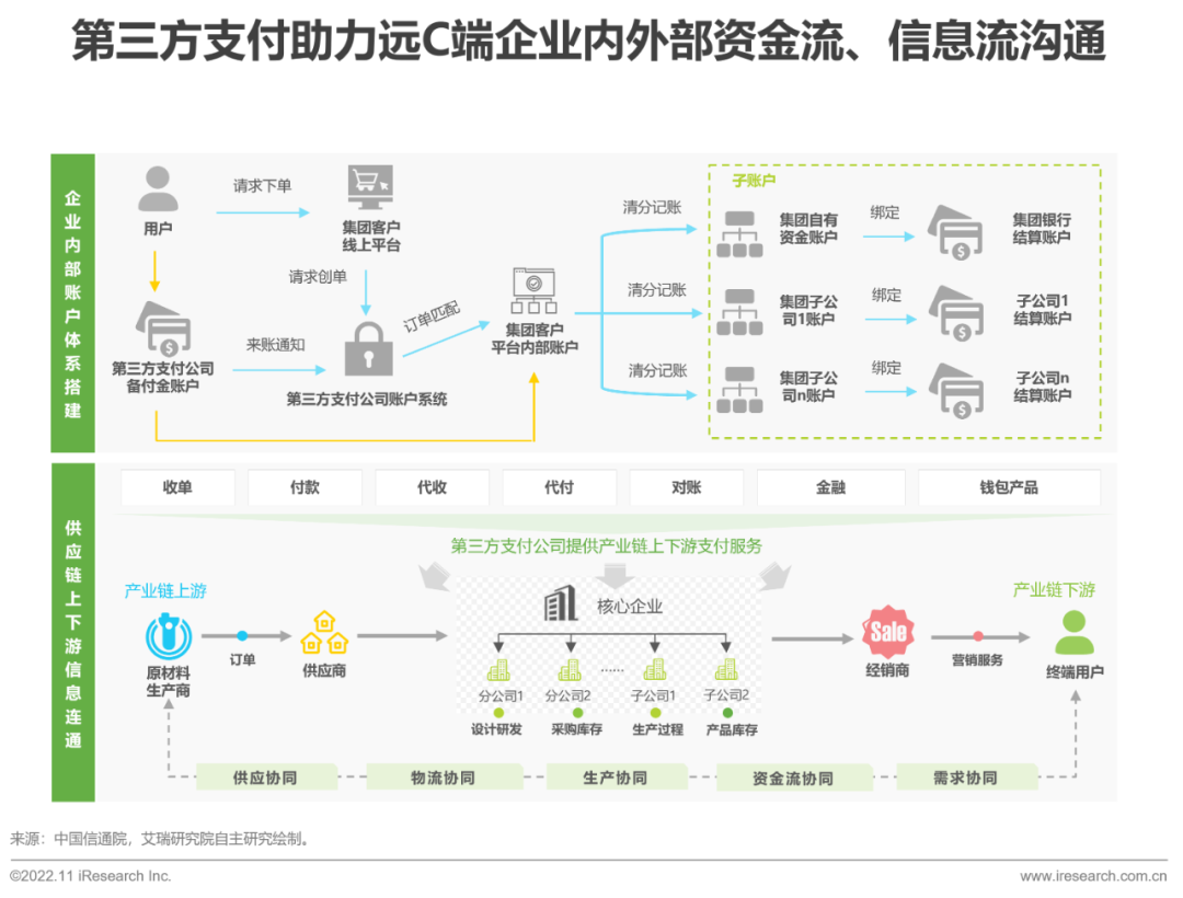远C端产业包含传统工业制造业、传统批发贸易业等,相比近C端产业,其业务模式更新迭代较缓慢,原因之一是远C端产业受C端消费数字化影响较小,其二是由乐刷于产业链条更长且更复杂,导致远C端产业中单点企业和供应链条整体的数字化都更为困难。近年来三次产业数字化发展数据表现也可直接反映出这一事实,第二产业数字化渗透率及增速都均远小于第三产业。产业数字化的第一乐刷步是实现供应链条整体业务数据化,第二步则是将数据反映出的信息价值反哺赋能给供应链各环节业务。在远C端产业数字化过程中,核心大中企业的带动作用尤为重要,这也正是第三方支付助力远C端产业数字化布局的切入口乐刷,即通过完整账户体系搭建,帮助核心企业疏通内部资金流与信息流流转,同时通过参与产业互联网平台建设,连通供应链上下游实现整体业务数据化与信息化。