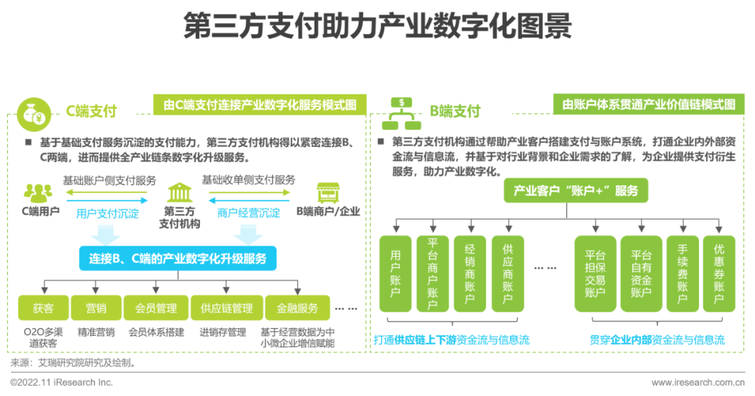 近年来,第三方支付不仅渗透到C端用户生活的方方面面,同时也已深入B端各产业全价值链。基于云计算、大数乐刷据、人工智能、物联网等技术积累,以第三方支付为切点的金融科技创新爆发着强大的生命力。通过海量支付数据的沉淀与积累,沟通产业资金流与信息流、重塑产业链价值,支付服务商向产业数字化综合服务商转变。在C端支乐刷付方面,通过打造流量与生态优势,第三方支付企业已快速在B端商户数字化升级服务市场打开局面,为餐饮、零售等行业场景提供贯穿获客、营销、运营等全经营环节的升级服务,是中小微企业数字化的重要推手。在B端支付乐刷服务方面,第三方支付为中大型企业、集团构建完备的数字支付与账户体系,充分解决“二清”等问题的同时,使企业资金流与信息流更加透明化,大大提升企业内部与供应链上下游资金周转效率,有效激活产业供应链整体交易乐刷的活跃程度,第三方支付已然成为产业数字化的有效入口与重要枢纽。