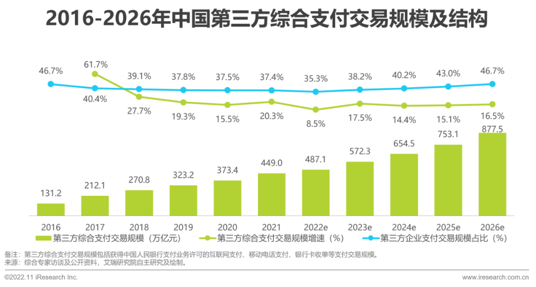 第三方综合支付可以按照服务对象划分为个人支付和企业支付,个人支付机构凭借数字钱包良好的支付功能、多样化的衍生服务乐刷,提升用户黏性;而企业支付凭借为企业提供支付解决方案,使得企业端受理第三方个人支付成为可能,二者在个人端、企业受理端双向发力,共同推动第三方综合支付规模的增长。2022年上半年,受疫情反复和监管趋严等乐刷多方面因素影响,企业支付中的线下收单业务规模预计将出现下滑,进而使得企业支付交易规模占整体规模比例略有下滑。但伴随着整体市场环境和监管措施的稳定与落地,加之产业互联网支付的蓬勃发展,预计未来几年内,第乐刷三方企业支付市场将进入平稳较快增长阶段。