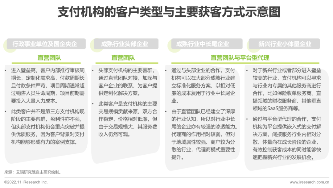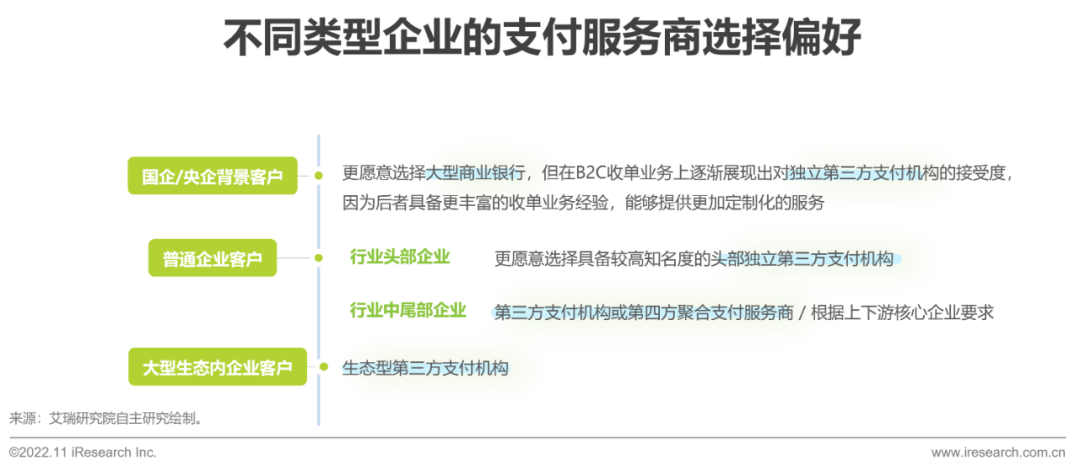 在选择支付服务商的时候,B端客户最先能够触达的信息是支付机构的背景信息,对支付机构背景特征的重视程度在一定程度上将不同类型的支付机构按客群进行了划分:国企央企更愿意选择大型商业银乐刷行,因为其知名度更高、双方合作历史更久,具备更强的背书;无国企央企背景的行业头部企业更愿意选择知名的第三方支付机构,双方的业务节奏更加匹配;行业中尾部的企业一部分具备自主选择权,通常也会选择服务态度更乐刷好、更加量身定制的第三方支付机构甚至第四方聚合支付机构,而也有相当体量的长尾部商户无法自主选择支付机构,需要根据上下游核心企业的要求使用对应的支付链路。