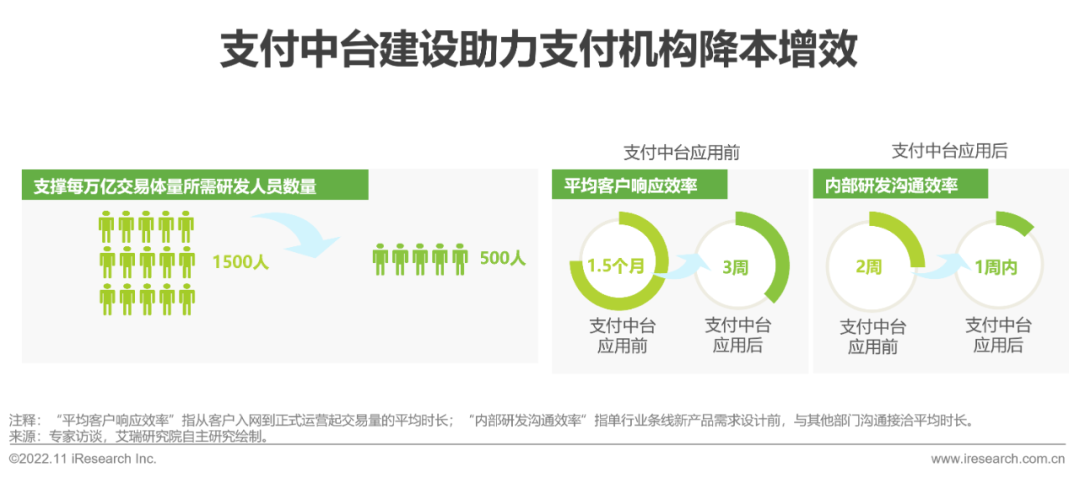 随着第三方支付企业不断拓展、深耕各细分行业领域,企业内部通常需要为各行业条线部署各自独立的技术开发团队,以满足不同行业场景定制化支付产品需求乐刷。而在这一过程中,存在大量重复性产品设计与搭建情况,造成企业资源浪费与效率低缓。因此近年来,头部第三方支付企业开始布局支付中台建设,通过集成业务中台与数据中台释放服务能力,满足复杂行业场景产品设计需求乐刷的同时,规避以往单行业产品设计需求对其他行业线及整体架构产生的交叉影响。第三方支付机构赋能产业数字化升级的过程,亦是促发自身数字化转型的契机,以支付中台建设为核心的经营效能升级,不仅可以有效降低企业人乐刷力、资源与时间成本,同时能够极大提升客户服务能力,更好地解决各行业痛点、助力产业升级。