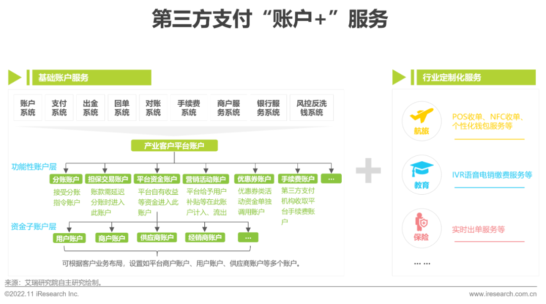 C端支付的成熟发展,带动了近C端产业快速线上化、数字化转型,支付作为交易的刚需一环,必然成为这一进程中的先乐刷行者。因此,以易宝支付、快钱、随行付为代表的第三方支付机构在近C端产业数字化服务中,是为重要推动者之一。近C端的大中型企业主要集中在航旅、教育、金融等行业场景,这类企业围绕其C端用户需求,对于支付服务乐刷的丰富度、定制化程度要求较高,而第三方支付机构定制开发灵活性高、定制周期短、服务体系完善等特点,能够很好满足此类客户需求。通过为产业内头部企业提供定制化需求,第三方支付机构进而可将标品化产品服务推广至乐刷产业内中小企业客户。近C端产业支付解决方案,通常按照行业场景进行划分,并以“账户+”服务形式出现,即除了包括收单、收付款、分账等在内的基础账户服务外,还涉及针对不同行业场景的定制化支付/账户衍生服务。乐刷
