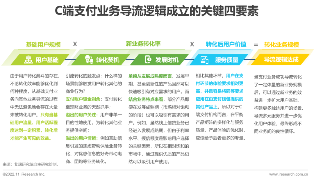 尽管C端支付业务具备引流多元金融服务和生活服务的能力,但并不是每一个C端支付业务的从业企业都能成功复制这一成长路径。艾瑞分析认乐刷乐刷展时机则是转化的新业务是否具备足够的吸引力、不可替代性从而形成规模的关键因素;服务质量是用户在转化后有效维持使用从而提高用户价值的保证。