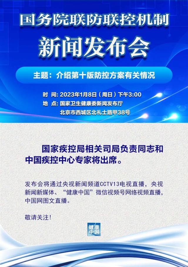 【预告:国务院联防联控机制将举行新闻发布会 介绍第十版防控方案有关情况】财联社1月8日电,国务院联防联控机制将于1月8日(周日)下午3:00将举行新闻发布会,介绍第十版防控方案有关情况,国家疾控局相关司局负责同志和中国疾控中心专家将出席。