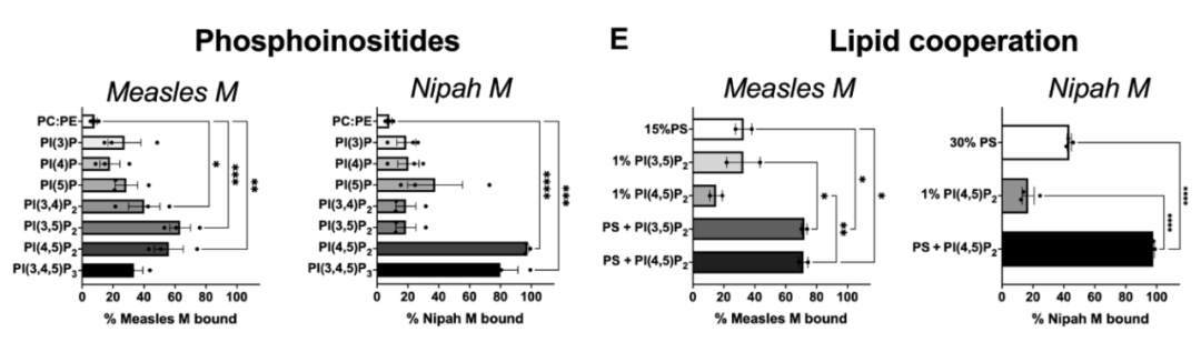 PI在组成细胞膜上较为次要,但在细胞膜运输和细胞信号传递中,却有着重要作用。在真核细胞中已经发现了7种PI。其中,麻疹病毒的基质蛋白主要吸附含有PI(3,5)P2和 PI(4,5)P2这两种磷酸肌醇的囊泡,而尼帕病毒的基质蛋白主要吸附 PI(4,5)P2和PI(3,4,5)P3这两种磷酸肌醇的囊泡。如果这些囊泡中还有PS,基质蛋白的结合能力会提高2.5~5倍。