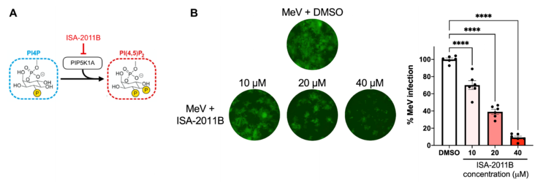 当发现 PI(4,5)P2的重要性后,研究人员开始在细胞实验中尝试降低PI(4,5)P2的数量,比如利用化合物ISA-2011B抑制合成PI(4,5)P2最后一步的酶,进而减少其合成,发现这样就能让抑制2种病毒M蛋白的吸附,导致M蛋白定位错误,并抑制最终的病毒合成数量。此外,针对PI(3,5)P2的抑制剂apilimod,也能抑制麻疹病毒的合成。