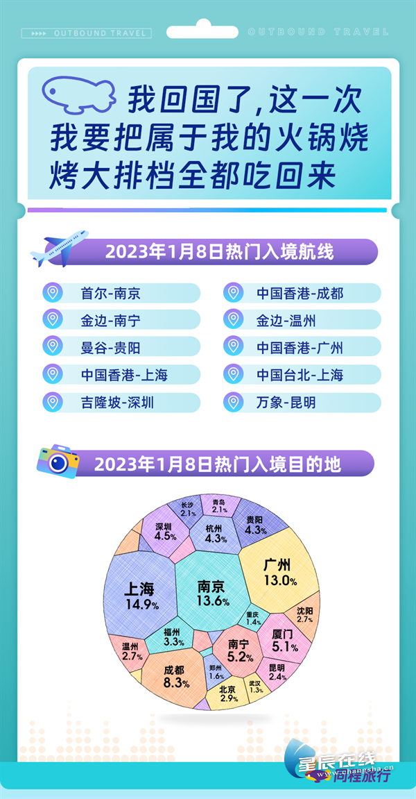 1月8日,中国香港与内地之间实现首阶段的通关,使得中国香港成为当天入境机票的出发地TOP1。当日,由中国香港飞往内地的机票订单量环比上涨62%,主要入境目的地包括上海、广州、成都、武汉和南京。而自1月8日零时开始,民航局取消了目的地为北京的国际客运航班从指定第一入境点入境,北京未来也将成为旅客入境的重要目的地之一。