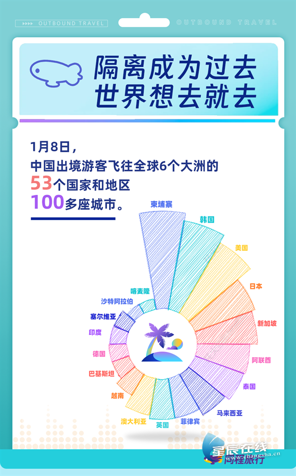 随着出入境防疫新政策落地,中国出境航班也迎来了一波小高峰。同程旅行数据显示,政策放开首日的热门目的地国家为柬埔寨、韩国、美国、日本、新加坡等。中国香港、中国澳门和中国台湾,也是内地居民出境的热门目的地,前往中国香港和中国澳门的机票订单在出境订单中占比达到20%。