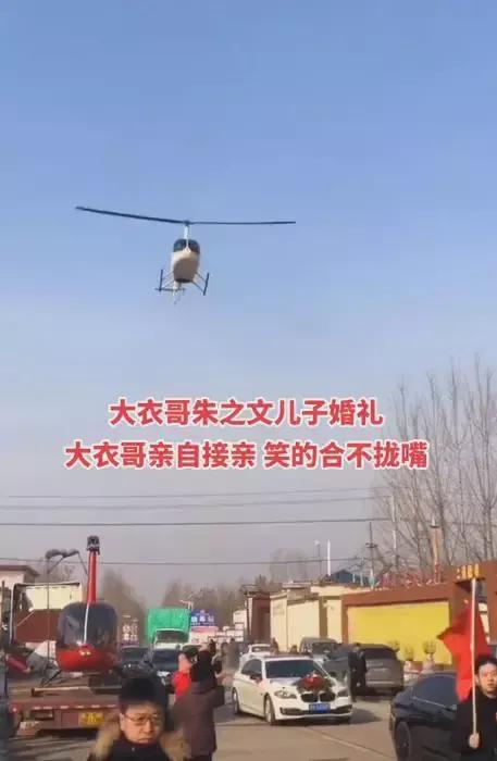 除了4个8的豪车,据说大衣哥还搞了直升机迎亲,从视频中看确实有直升机出现的镜头,也就是一飞而过。