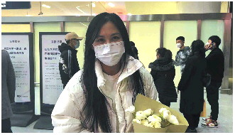随着航班的抵达,到达等候处的人也渐渐多起来。许多等待的市民难掩激动之情,从后方挪到到达口的护栏前。随着到达口大门的打开,回国乘客推着大大小小的行李陆续走了出来。有人为到达的朋友送上早已准备好的鲜花,也有回国的男孩为父母送上大大的拥抱。韩国留学生小李在刚出门口时,就收到了弟弟为她准备好的白色洋桔梗,父母也已在后面等候许久。小李说已经两年半多没回来了,“之前有次想回国,但是因为疫情期间回来流程比较麻烦,最后还是把机票退了”。她表示,这次回来非常激动,飞机落地的那一刻差点哭出来。