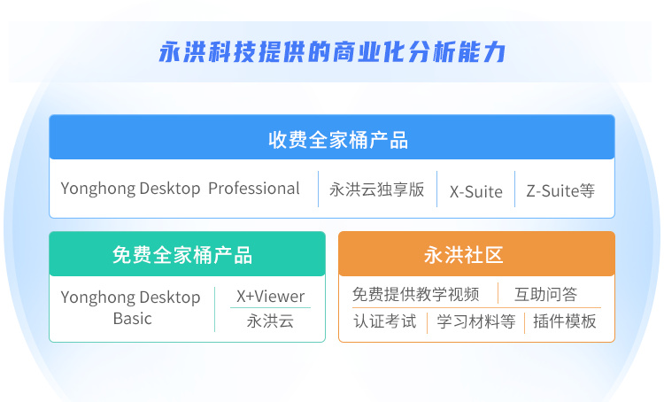 针对业务用户商业分析时代的需求特征,永洪科技构建了更为全面的产品体系,即以永洪社区为基础,“免费全家桶”产品组合为支柱,“付费全家桶”产品组合为核心的模式。