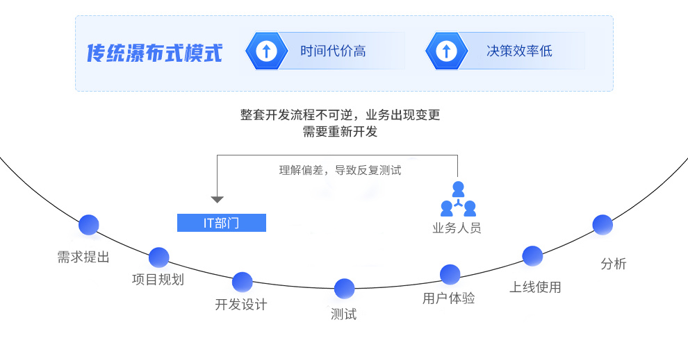 传统BI属于“瀑布式”模式,是一种不可逆的流程模式。即先由业务人员提出需求,然后由IT部门完成项目规划、开发设计、测试、用户体验,最后才能上线给到业务人员使用,沟通成本高,上线周期拉长。
