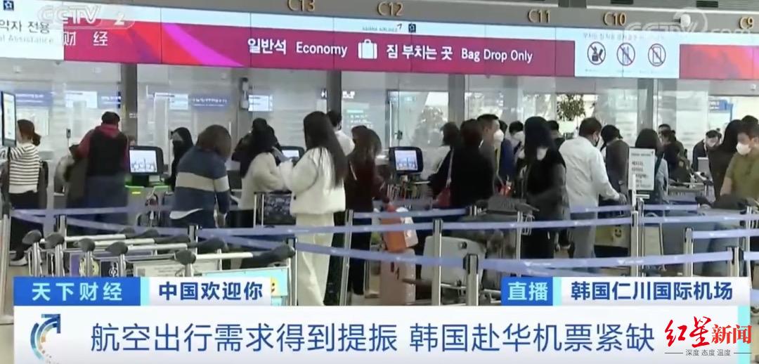 1月8日,韩国仁川国际机场共有6个航班飞往中国内地。央视财经记者了解到,航空出行的需求得到提振,机票变得供不应求。截至本月底,主要航企直飞中国的航班座位几乎都已经售罄。在韩国的票务网站上,连中转赴华的机票也很抢手,目前仁川到北京的票价最高被炒到约合1万元人民币,是去年的好几倍。
