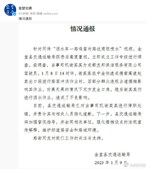 成都金堂县交通运输局官方微博@金堂交通 1月9日通报,针对网传“洒水车一路鸣笛对路边商贩喷水”视频,金堂县交通运输局获悉后高度重视,立即成立工作专班进行调查。经调查,当事司机谢某某为成都友邦保洁服务有限公司驾驶员。1月8日14时许,谢某某在中金快速成德南高速赵家出口段进行路面冲洗作业时,因部分群众违规占道摆摊影响其作业,劝离无果的情况下双方发生口角,随后谢某某仍进行洒水作业,造成了不良影响。
