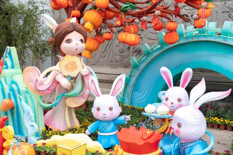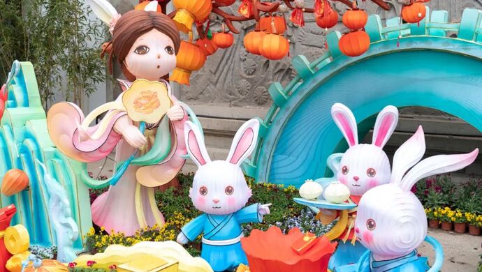 在上海古猗园,“年、趣、家、春、乐”五大主题新春灯景区域已经准备就绪,让市民游客今年新春佳节可以在江南古典园林中观灯赏春。古猗园的照壁区域还更新了一组以“张灯结彩辞旧岁,阖家团圆聚猗家”为主题的迎客彩灯,兔仙子和她的三个兔宝宝在石榴树下准备了许多福袋,把好运送给大家。