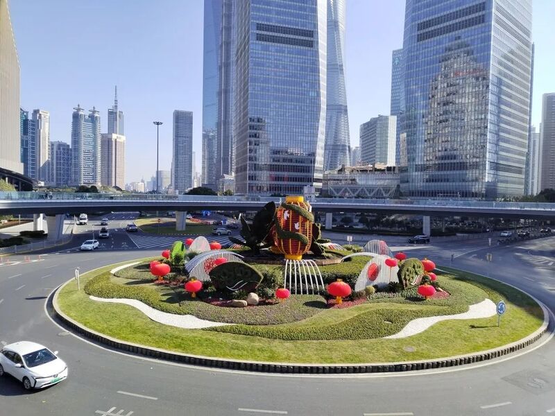 花坛外围有5组扇形绿雕墙,“绣”有梅花图案,意为国泰民安,还有几十个高低错落的大红灯笼点缀其中,让途径陆家嘴环岛的人们一眼便知春节将至。