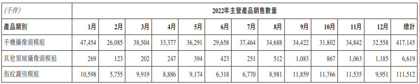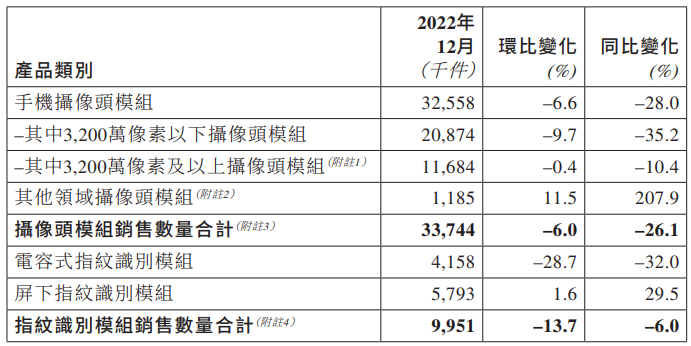 丘钛科技1月10日在港交所公告,2022年12月摄像头模组销售数量合计3374.4万件,同比减少26.1%。摄像头模组产品销售数量环比减少,主要是由于客户项目週期因素;同比减少主要是由于受宏观形势影响