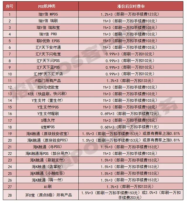 而到了近期,大量支付公司的POS机集中涨价,且涨价幅度较大,下面就列举一些支付公司POS机产品的涨价详情表。