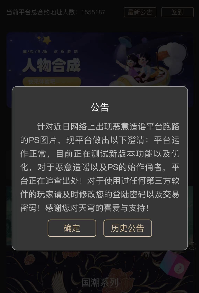 6月6日,针对网传有“出于人道主义发个最后的公告,很遗憾经营不当跑路。各位韭菜们好自为之吧,感谢各位一个月的付出。已经财富自由各位为后会有期漂亮国见-天穹管理组宣”字样的图片,“天穹”数字藏品平台AP乐刷官网P澄清,该图片系PS。