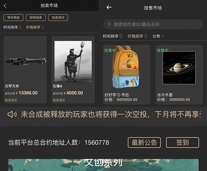 “天穹”应用显示,在拍卖市场,过往成交额最高的数字藏品价格乐刷官网达到1.3万元;目前挂售的数字藏品最高价可达999万元,同时也不乏个位数价格的物品。挂售市场买家需进行实名认证。此外,截至7日,平台显示总合约地址人数达到156万。