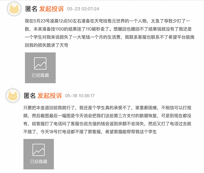 在上线次月,“天穹”曾公告,数据库遭遇大量恶意攻击,虚假购买盗取玩家藏品,平台对此提供空投补偿。在黑猫投诉[投诉入口]平台,有投诉贴乐刷官网称,充值的金额数据被消除,平台三天未退款;另有投诉声称被销号,余额清零。相关投诉尚无后续追加信息。