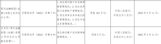 而另一家收到百万级罚单的现代金控被罚104万元。相关负责人现代金控河北分公司副总经理王志杰被罚款5万元。