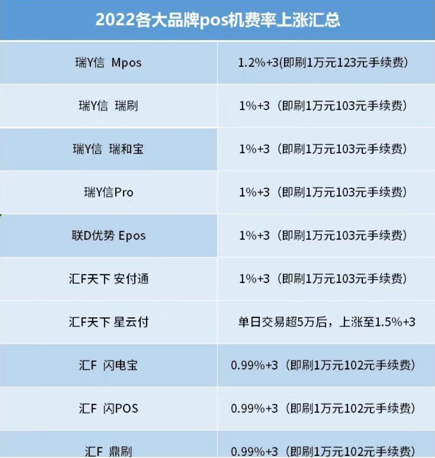 2022年8月份是支付行业动荡不安的一个月,多家支付公司为了应对巨额的天价罚单,十几家第三方支付公司纷纷上涨了旗下POS机收单产品的用户刷卡费率,本来支付公司涨价都是行业常态了,但是这次涨价与以往不同下各第三方支付公司的POS机费率上涨信息: