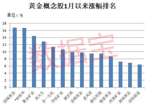 数据宝统计,1月至今短短5个交易日内,黄金概念指数累计涨幅4.46%,跑赢同期上证指数1.65个百分点。园城黄金、*ST荣华、紫金矿业、周大生、金一文化、华钰矿业等6股累计涨幅超过10%。