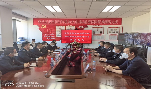 中国民航网 通讯员代雪茹 报道:1月7日10点37分,国航CA910(莫斯科-呼和浩特-北京)搭载176名旅客落地呼和浩特机场。期间,分流国际航班各参保单位领导齐聚指挥部举行收官仪式,共同见证分流国际航班的收官时刻,机场公司总经理孙广平、党委书记孟令民及各保障单位领导出席活动。