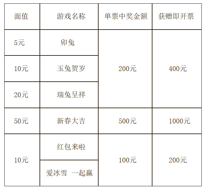参与本次活动的6款票种,5元面值的“卯兔”采用中华传统文化的剪纸风格;10元面值的“玉兔贺岁”造型活泼,既有放鞭炮过大年的,也有踢足球健身的;20元面值的“瑞兔呈祥”吉祥喜庆,具有浓浓的节庆氛围;今年特别推出的50元面值“新春大吉”采用红灯笼、元宝、喜鹊等元素进行设计,象征着喜庆、财富和好运,极具文化韵味也会带来更多的快乐体验;10元面值的“红包来啦 让好事发生”是体彩和东来也联名共创的主题票,搭载传统文化的国潮设计风格,票面很是抓人眼球;10元面值的“爱冰雪 一起赢”票面展示了人民群众参与冰雪运动的画面场景,设计风格年轻时尚,让您只用动动手指头也能随时随地玩转“冰雪”。精美的票面、美好的寓意、超多的惊喜,新春主题即开票都能满足你,快快把它列入您的年货清单,为您的新年焕新添彩!