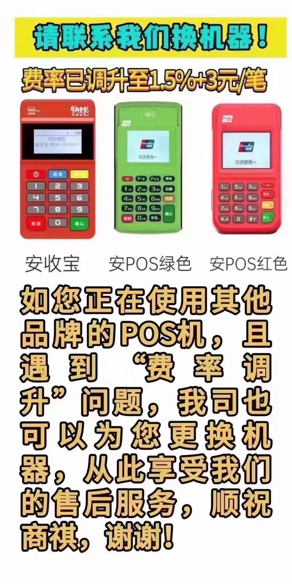 嗨~最近,有一个用户投诉!调查发现,各大支付公司品牌的POS机大幅提高了费率。更重要的是,最高费率是600+3!如果出现这种问题,建议禁用它!如果你想知道你现有的POS机是否存在这种情况,你可以先支付