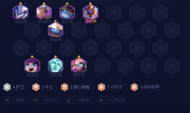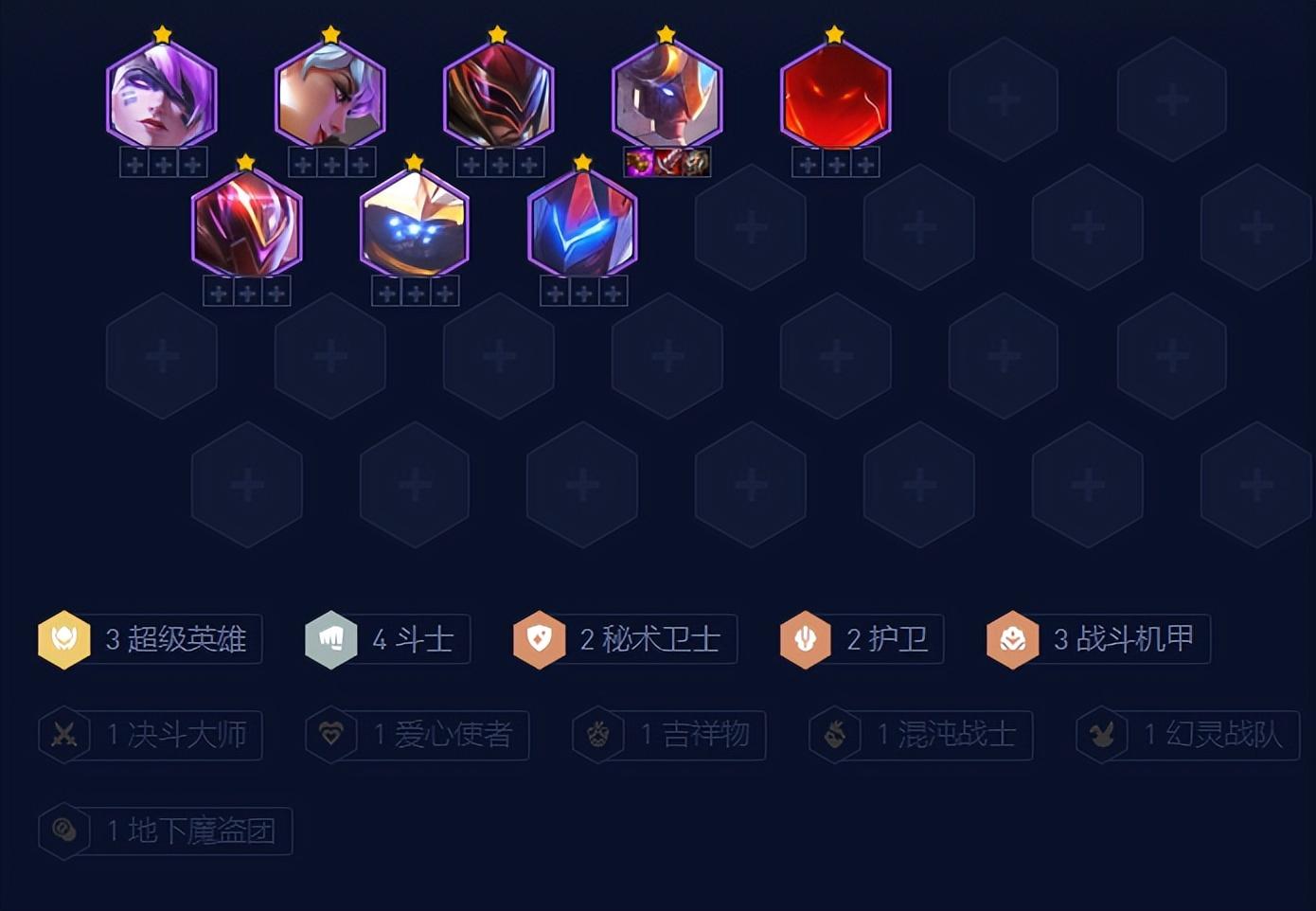 三机甲猴子德莱文搭配上武器大师组成三机甲,然后船长盲僧搭配上石头人组成三超级英雄,而盲僧和武器大师还能组成双斗士,略微提升一下阵容的肉度。这套羁绊搭配到这里基本上也算是就成型了,以超级英雄为主的赌狗阵容,最为重要的也是提升阵容内英雄的星级。