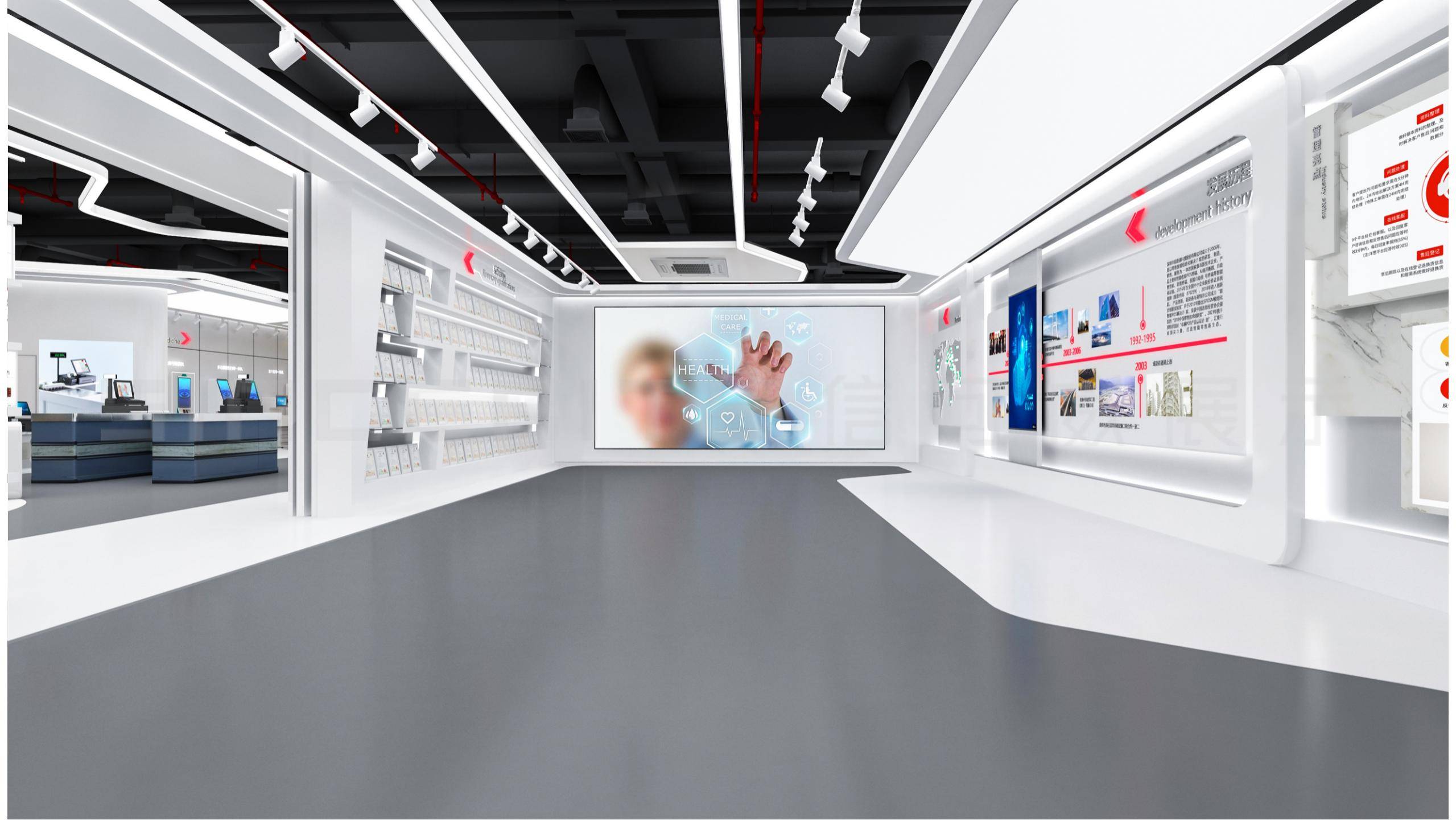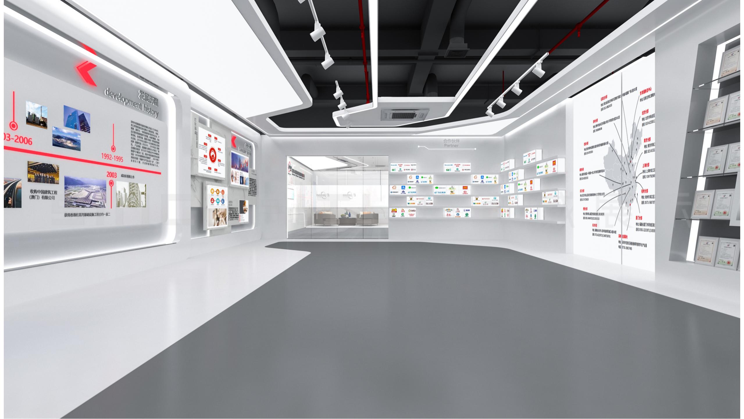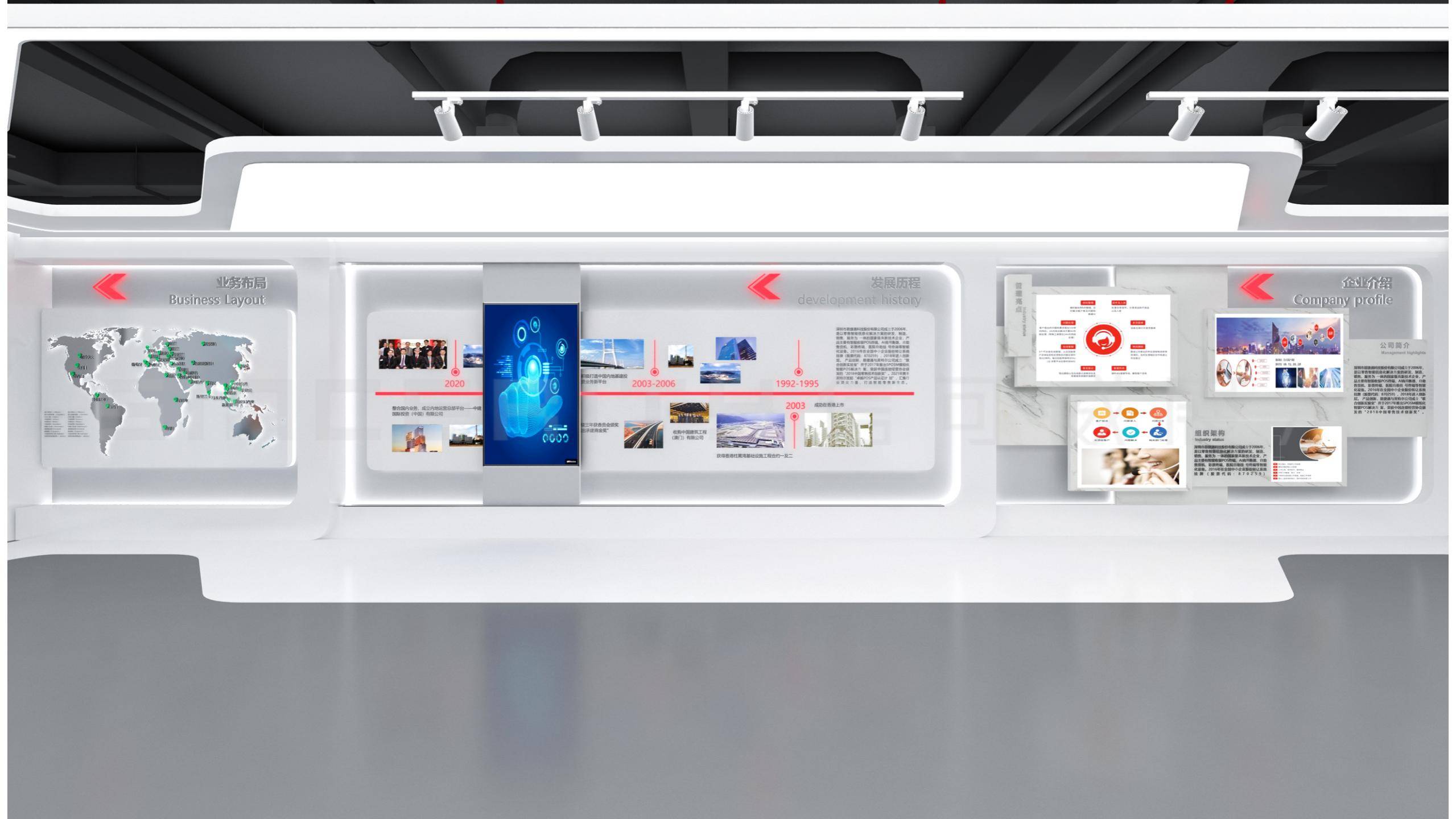 墙面结合天花结构乐刷官网,配合多种造型展板,全方位展示企业实力,大屏视觉冲击让参观者对企业实力、发展历程有一个更全面立体的了解。