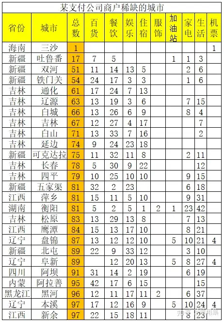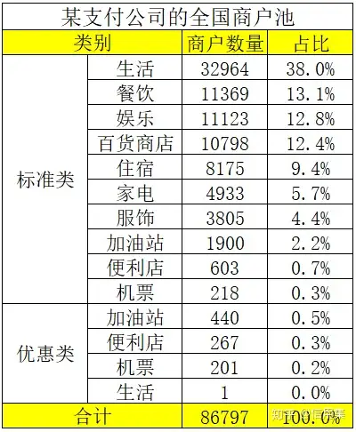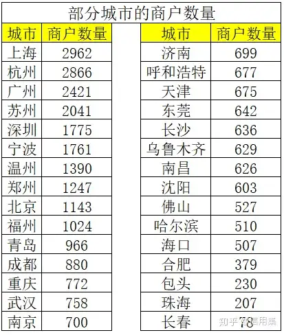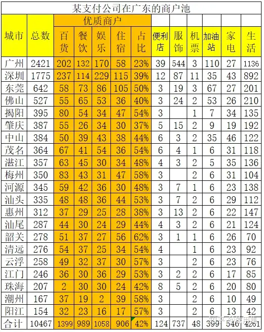 如果在大城市,商户数量肯定是够用的,至于优质商户,一般指的是百货、娱乐、住宿和餐饮,乍一看,每城市的优质商户数量和比例都不一样。